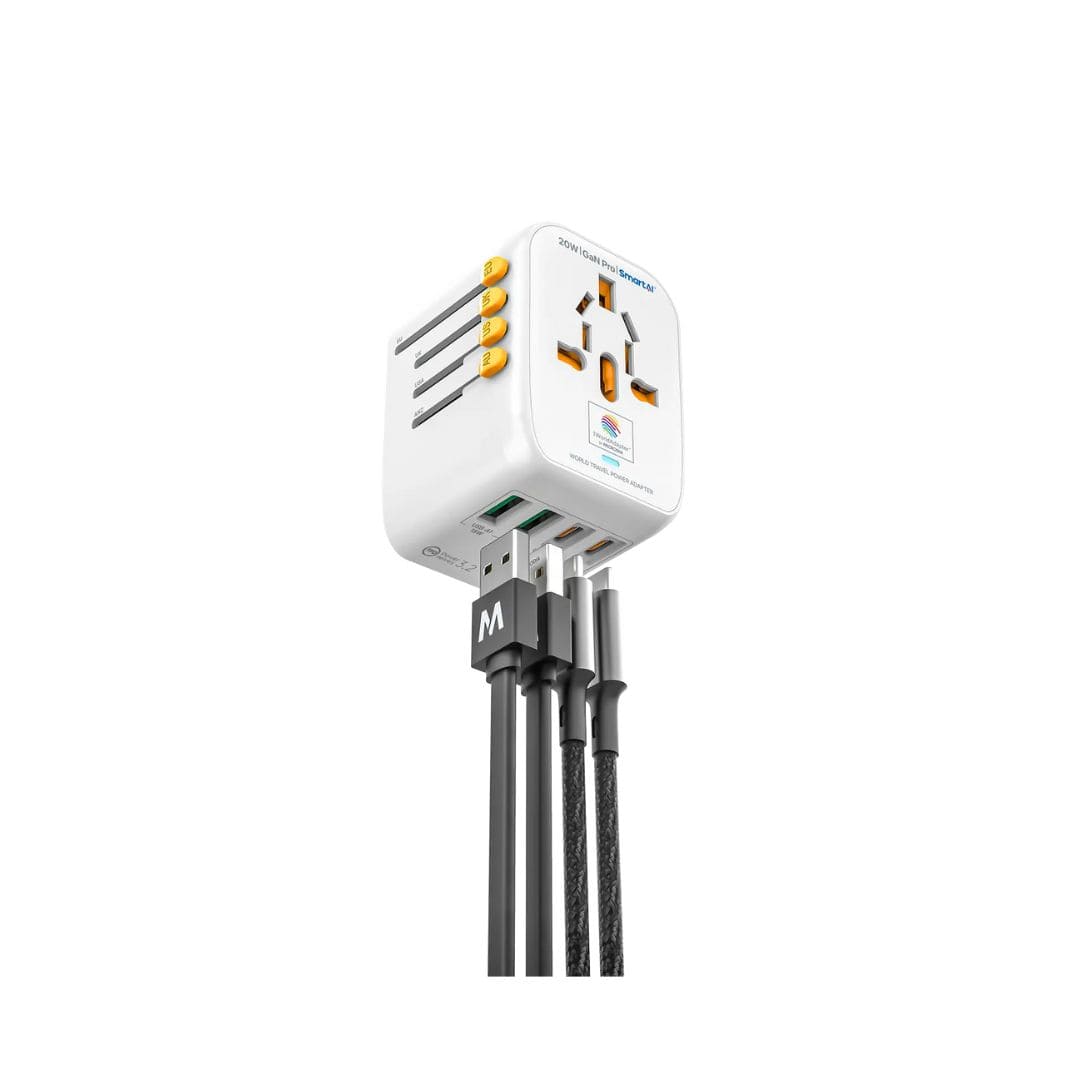 Travel Adaptor features 4 USB Ports – 2× USB-C (PD 3.2) + 2× USB-A (QC 4+) for multi-device charging